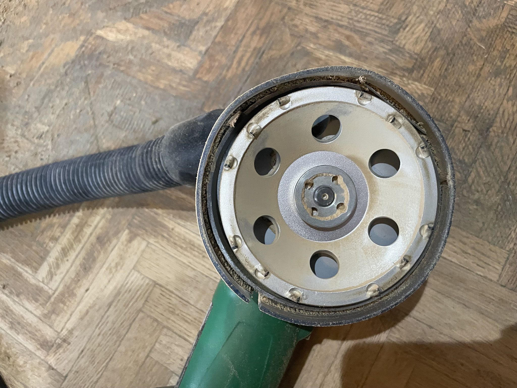 通常、100mm無段変速ディスクグラインダー+パッドバッカーにて使用することにより平面研磨が容易で研磨後のウロコ痕が残りにくく、研磨時の音も静かです。